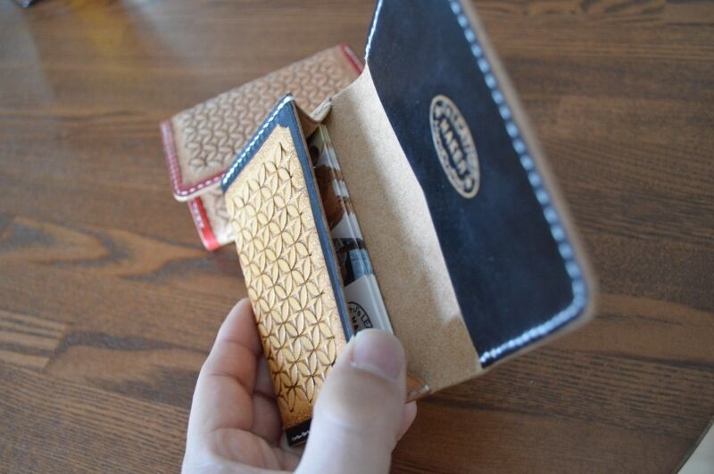 ヌメ革に、刻印で模様を刻み込んだ個性的な名刺入れです。