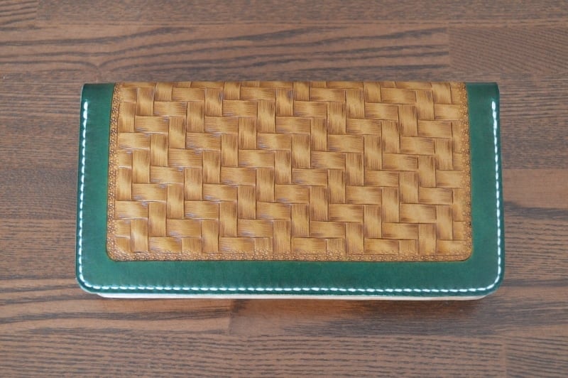 イタリアヌメ革にアジロ編みをカービングで表現したスリムタイプのロングウォレット・お札入れ。縁取りグリーン&アンティーク仕上げバージョン。