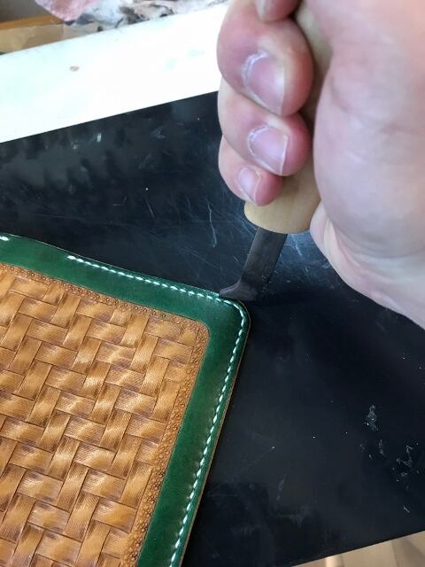 編み込み部分は、スウィベルナイフによるカットと、加工刻印による打刻で表現しました。