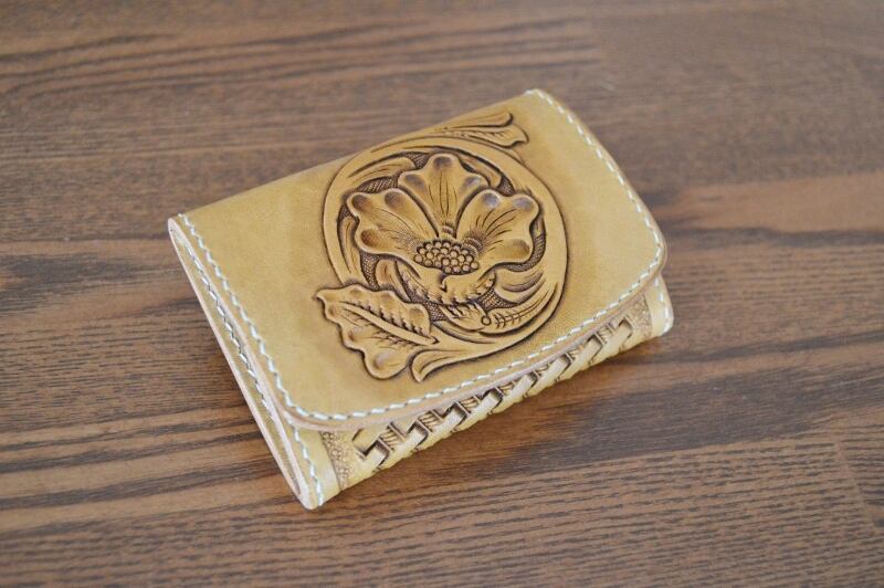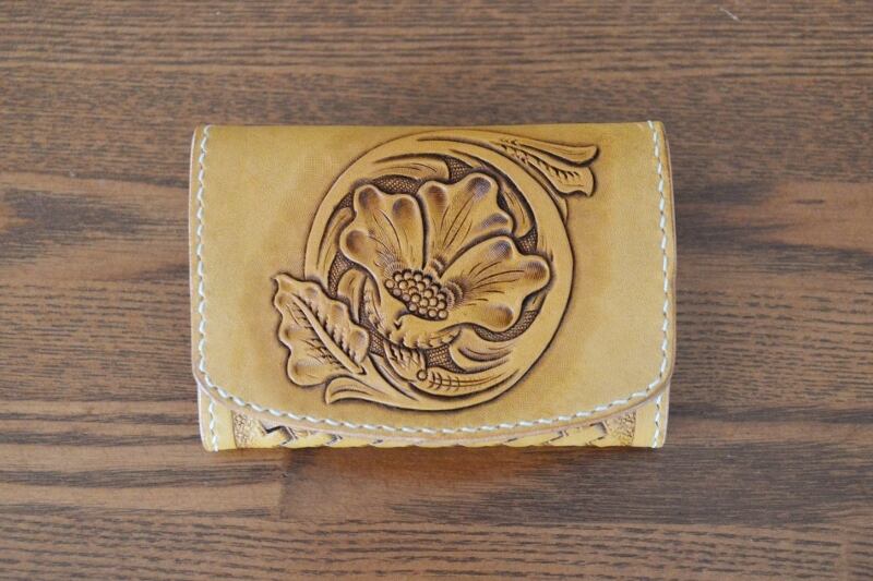 国内なめしのヌメ革に、フラワーのカービングとバスケットスタンピングを施したBOX型のミニ財布。