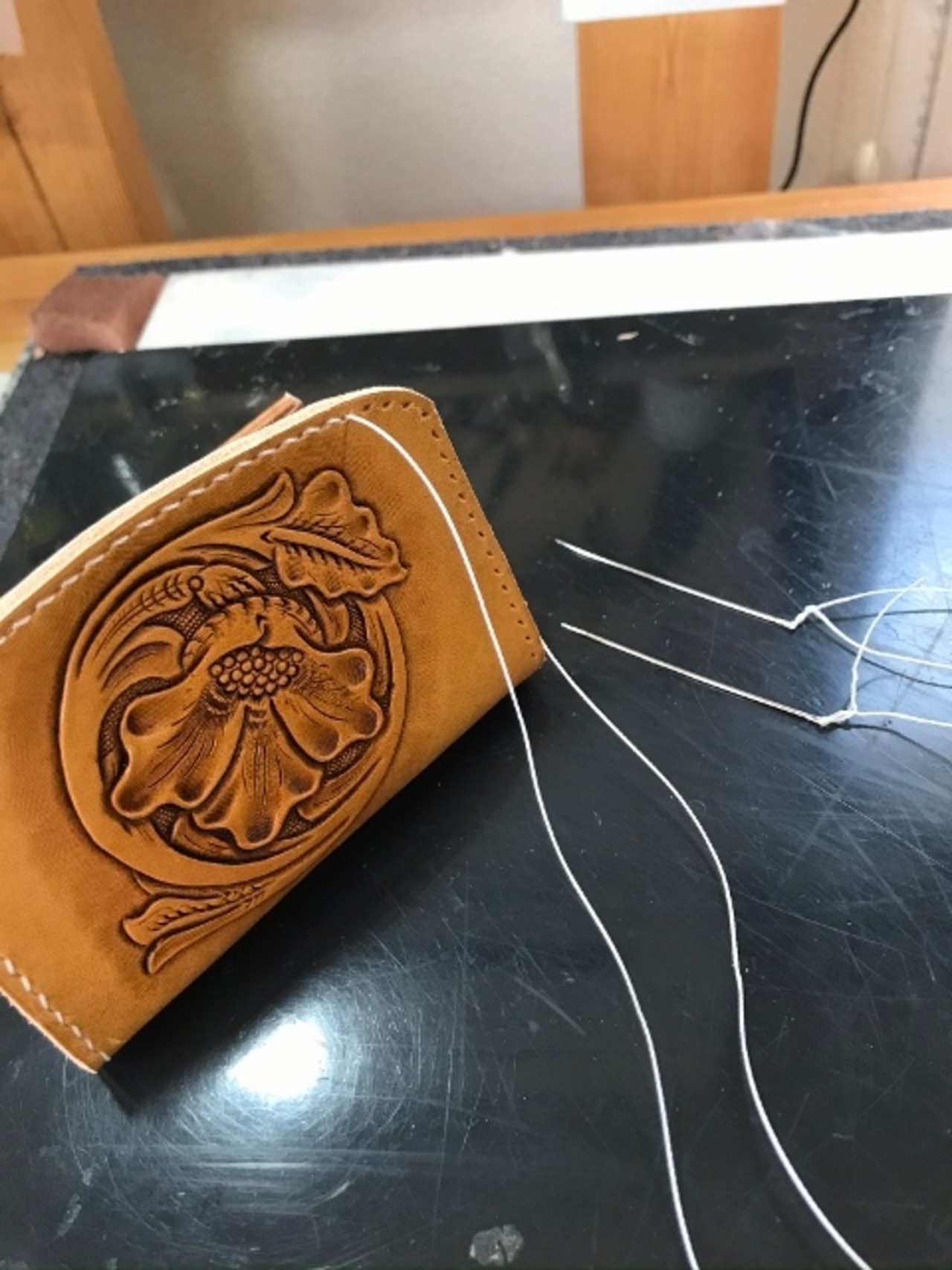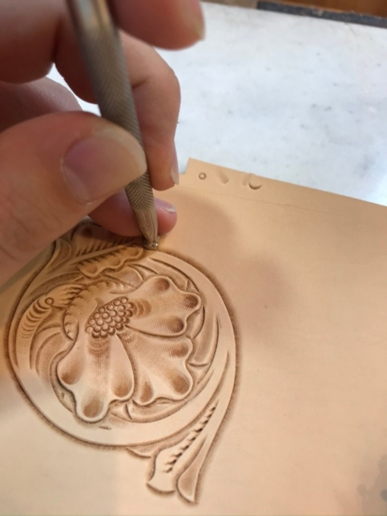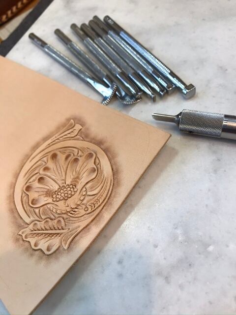 カービング、スタンピングは一打一打刻印で模様を表現し、縫製は一糸一糸手縫いで丁寧に縫い上げています。