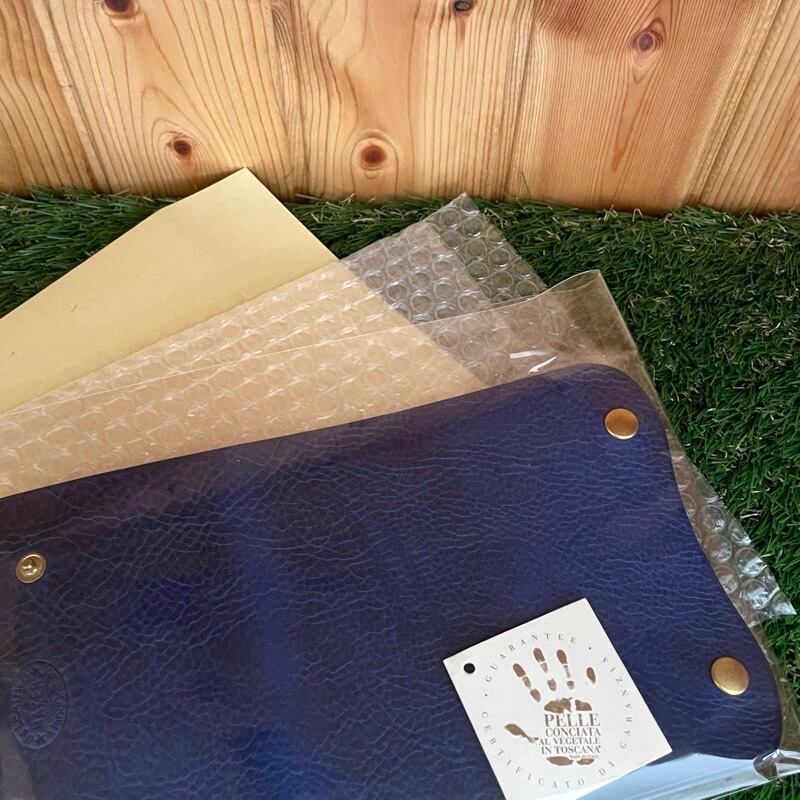 革は、イタリア、ラ・ぺルラ・アッズーラ社製のシボありオイルレザー・アマゾニアと表面にワックスが付いているロウ付き革・アラスカの2種。