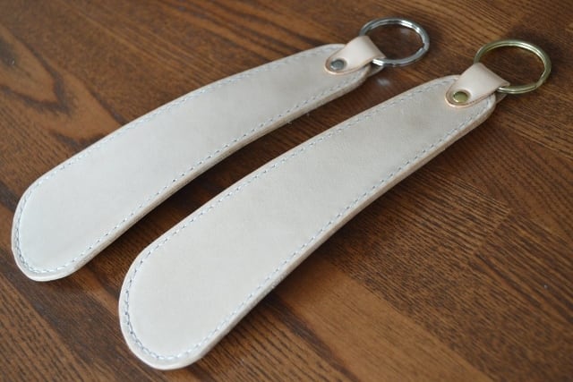 ヌメ革に、雪の結晶のような模様をつけた靴べらキーホルダーです。